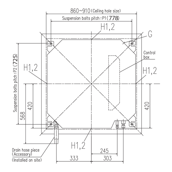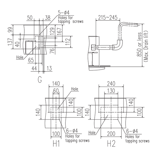 H1, H2. Air outlet opening for ducting ø125, ø200