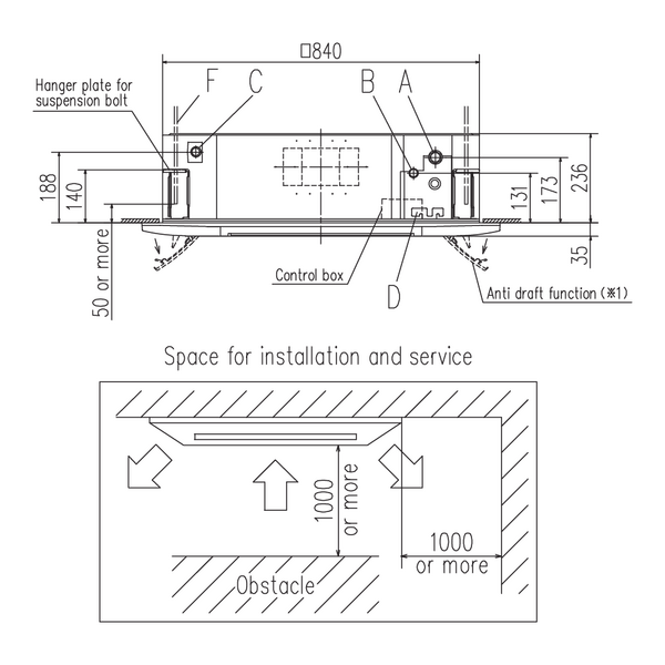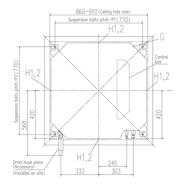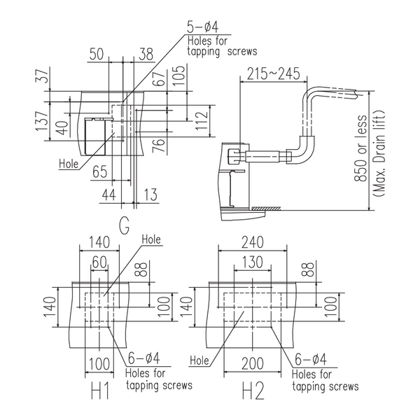 H1, H2. Air outlet opening for ducting ø125, ø200