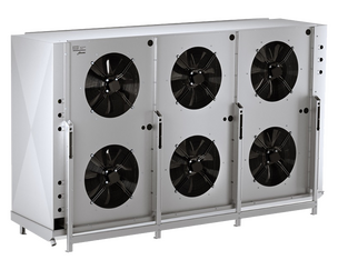 The coolers are floor-mounted, consisting of vertical modules with two axial fans positioned upstream of the coil block, delivering horizontal airflow through the heat exchanger. The fans incorporate aerodynamically optimized blades, designed to generate high static pressure, ensuring uniform air distribution across the refrigerated space.