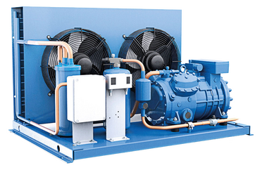 A wide range of commercial and industrial Frascold air-cooled condensing units for medium and low evaporation temperature applications. The condensing units have been adapted for use with refrigerants from the HCFC, HFC, and HFO groups, with displacement ranging from 4.0 to 56.0 m3/h. The units are equipped with semi-hermetic reciprocating compressors, AC fan motors, and condensers with large exchange surfaces (tropical) enabling their use in high ambient temperatures up to +48°C. The units are available in two configurations: standard and with additional equipment. Both versions can optionally be equipped with metal enclosures for external installations. The possibility of expanding the device with additional options and accessories increases the flexibility of applications. The unit parameters comply with the EcoDesign Directive.