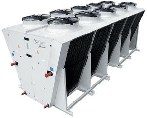The range of ECO Modine VCE-W industrial dry coolers is available with horizontal or vertical air discharge intended for application in refrigeration, air conditioning and process cooling installations Series available with a nominal capacity from 53.40 to 808.00 kW. They are equipped with an axial fans with diameter: 800 and 910 mm. The V-shaped heat exchanger provides optimized unit dimensions, simplifying service and reducing the installation area. Fin spacing 2.1 mm for the entire series. VCE-W dry coolers can operate in the temperature range from -25 to +60°C with optional EC fans. On request they can be equipped with non-standard block fin tubes and fan motors.