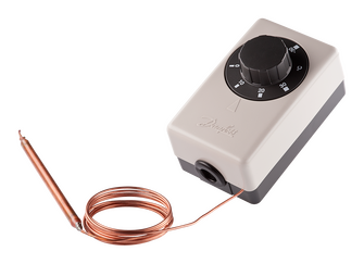 Danfoss UT thermostats are temperature-controlled electrical switches with a capillary and a stainless steel or copper sensor. A large knob on the front of the thermostat allows precise temperature adjustment. Danfoss UT thermostats are available with a fixed switching differential of 2.3°C and automatic reset. They are suitable for wall or panel mounting. These electrical switches are most commonly used in: cold rooms, beverage coolers, ice cream production equipment, milk coolers, air-conditioning units, and heat recovery systems.
