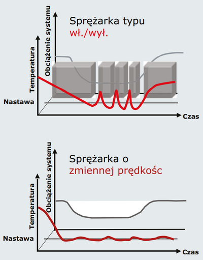 Technologia zmiennej prędkości polega na zmianie obrotów sprężarki, co przekłada się na wielkość przepływu czynnika chłodniczego. Sprężarka wykorzystuje przetwornicę częstotliwości – zwaną również falownikiem – która płynnie zmniejsza lub zwiększa obroty silnika napędzającego sprężarkę. To właśnie w ten sposób sprężarki z falownikiem zapewniają najwięcej oszczędności w porównaniu z innymi technologiami.