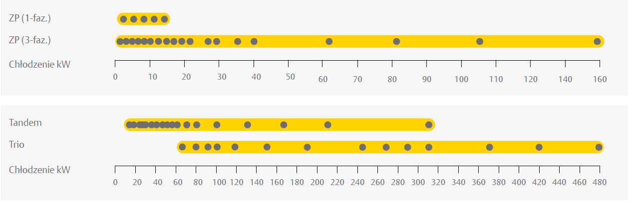 Typoszereg hermetycznych sprężarek spiralnych Copeland Scroll na czynnik chłodniczy R410A, przeznaczonych do zastosowań związanych z klimatyzacją i chłodzeniem technologicznym/precyzyjnym, w zakresie wydajności wolumetrycznej od 4,0 do 77,3 m3/h. Sprężarki serii ZP doskonale nadają się do zastosowań w agregatach wody lodowej (chillerach) ze skraplaczem powietrznym do 900 kW (1100 kW w przypadku skraplacza wodnego), zapewniając wysoki komfort i doskonałą efektywność sezonową (ESEER). Możliwość łączenia w zespoły wielosprężarkowe tandem (wydajność chłodnicza: 310 kW) lub trio (wydajność chłodnicza: 480 kW).