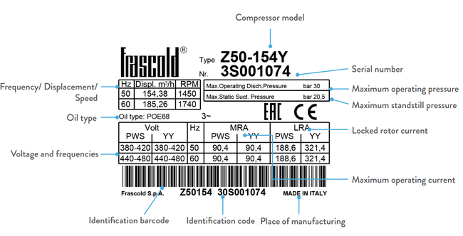 Sprężarki semihermetyczne W standardowo wyposażone są w silnik z dzielonym uzwojeniem (PWS), zawory na ssaniu i tłoczeniu z przyłączami lutowanymi, puszkę przyłączeniową IP56, czujnik temperatury tłoczenia, wyłącznik ciśnieniowy oleju, dwa szkła wzierne przystosowane do zastosowania mechanicznego lub elektronicznego regulatora poziomu oleju, gumy antywibracyjne, czujkę temperatury tłoczenia PTC, wyłącznik ciśnieniowy oleju. Napełnione olejem poliestrowym POE oraz gazem obojętnym (azotem) pod ciśnieniem 1 bar dla ochrony przed wilgocią. Smarowanie zapewnione jest przez wysokociśnieniową pompę olejową. Oprócz modeli standardowych, Frascold oferuje także wersje specjalne- modele przeciwwybuchowe ATEX.