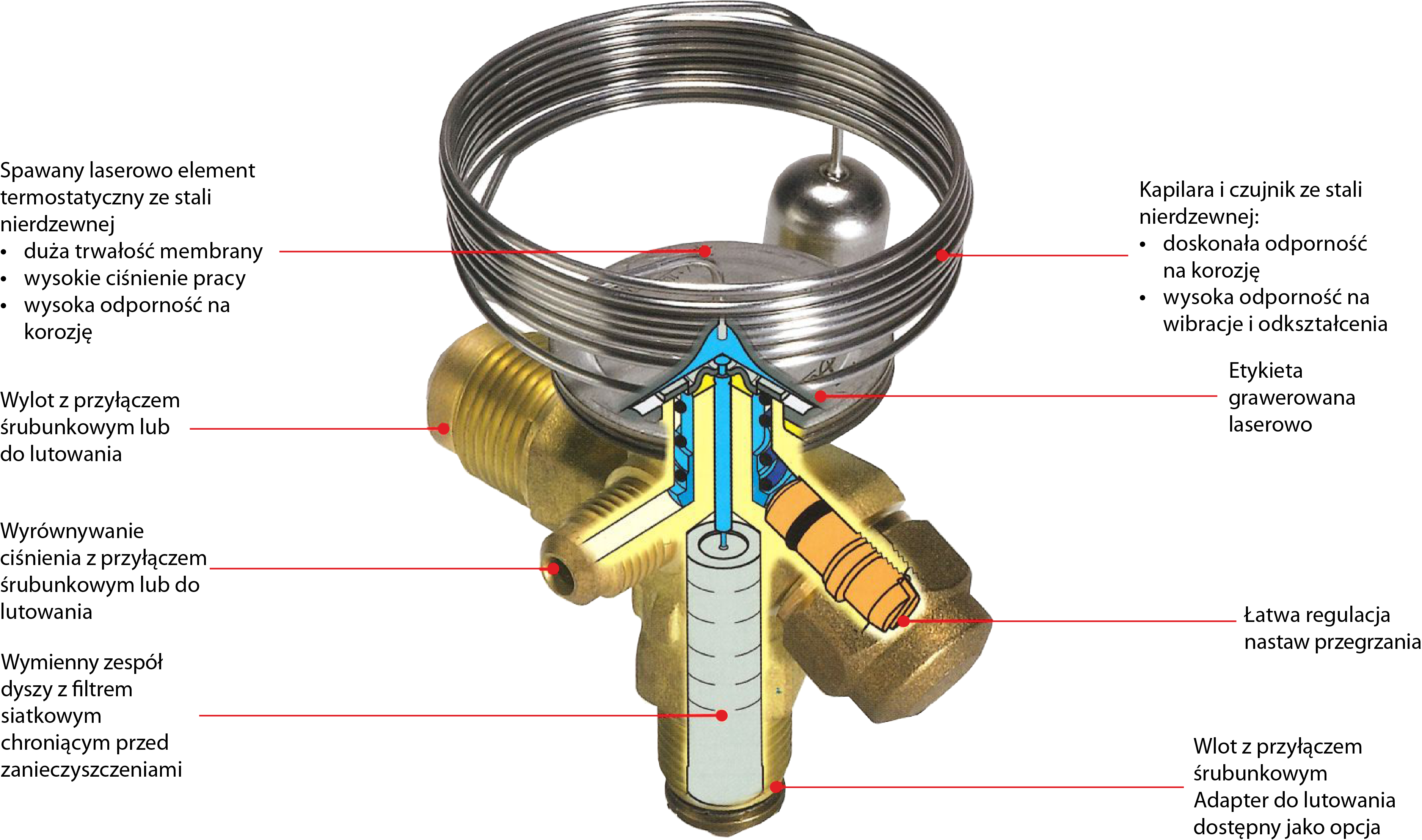 Termostatyczne zawory rozprężne Danfoss T 2/ TE 2 nadają się szczególnie do wtrysku cieczy w parownikach „suchych”, gdzie przegrzanie na wylocie parownika jest proporcjonalne do obciążenia parownika. Mogą być dostarczane dla specjalnych zakresów temperatur wymaganych przez konkretną instalację. Kapilara oraz czujnik ze stali nierdzewnej zapewniają wysoką odporność na korozję oraz wibracje i odkształcenia. Dostępne wersje z MOP (maks. ciśnienie pracy), zabezpieczające silnik sprężarki przed przeciążeniem przy nadmiernym ciśnieniu parowania.