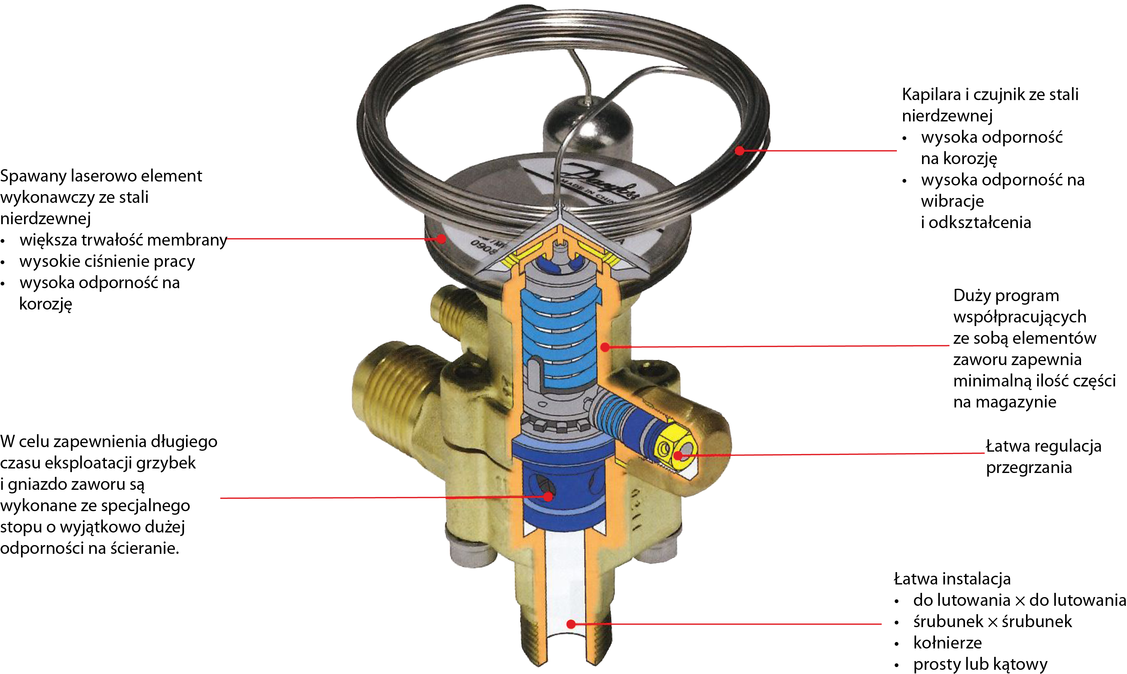 W celu zapewnienia długiego czasu eksploatacji grzybek i gniazdo zaworu są wykonane ze specjalnego stopu o wyjątkowo dużej odporności na ścieranie. Kapilara i czujnik ze stali nierdzewnej zapewniają wysoką odporność na korozję, wibracje i odkształcenia. Wymienny element termostatyczny wykonano z wykorzystaniem sprawdzonej techniki spawania laserowego firmy Danfoss, co przedłuża jego żywotność.