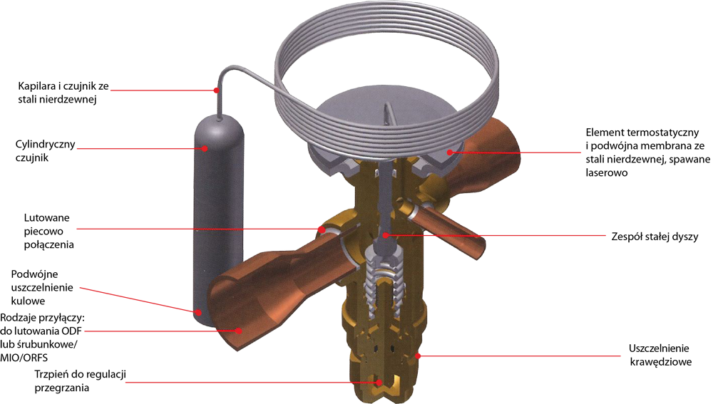 Typoszereg termostatycznych zaworów rozprężnych Danfoss TGE o innowacyjnej konstrukcji, przystosowanych do pracy z czynnikami chłodniczymi: R22, R134a, R290, R404A, R407A, R407C, R407F, R410A, R454B, R507, R513A. Zawory TGE wyposażone zostały w miedziane przyłącza odpowiednie również do zastosowań z wysokociśnieniowymi czynnikami. Dostępne w szerokim zakresie średnic oraz rodzajów przyłączy: do lutowania, śrubunkowych, MIO i ORFS.