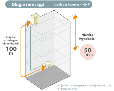 Możliwość tworzenia długich do 100 m rurociągów (w zależności od wyboru jednostki zewnętrznej) oraz różnica poziomów między jednostką zewnętrzną i wewnętrzną wynosząca aż do 50 m, zwiększają elastyczność projektowania instalacji.